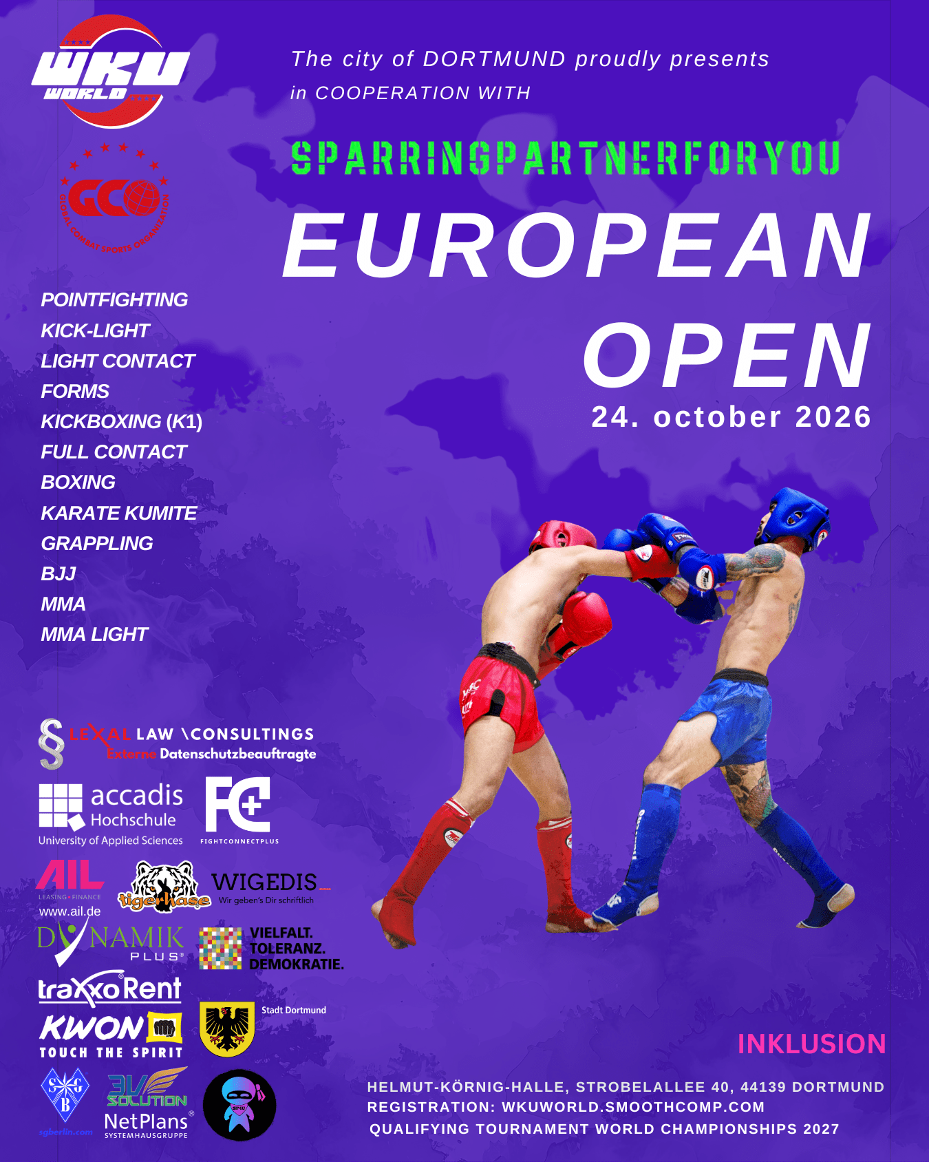 SPARRINGPARTNERFORYOU e.V. und die WKU veranstalten gemeinsam mit der Stadt Dortmund ein internationales Kampfsport-Großevent auf höchstem europäischem Niveau.